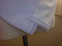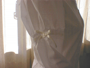 セーラーと袖の切り替えにはばら柄のはしごレースにサテンリボンを通しました。