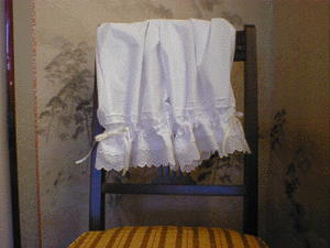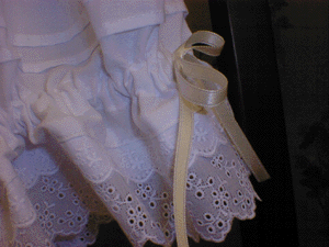 * ドロワーズ 3 * 終了しました。 少し短めのドロワーズです。 裾には二種類のレースが付いていて、脇にはサテンリボン、 身頃には細めのタックを取りました。 肌触りと吸湿性のの良いやや薄手の綿地。 ウエストだけでなく、裾もゴムですので、とても楽に着用して頂くことが出来ます。 価格3000円 tcブロード。 丈は約43センチ(レース含む)。 裾とウエストはゴム。