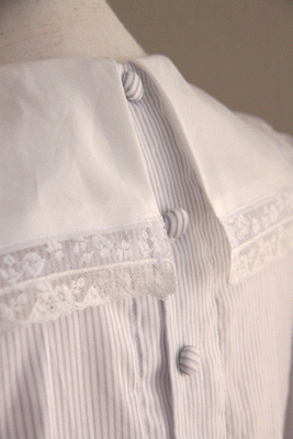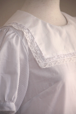 衿はスクエアカラーで周りに二種のフランスレースをつなぎ、縫いつけています。